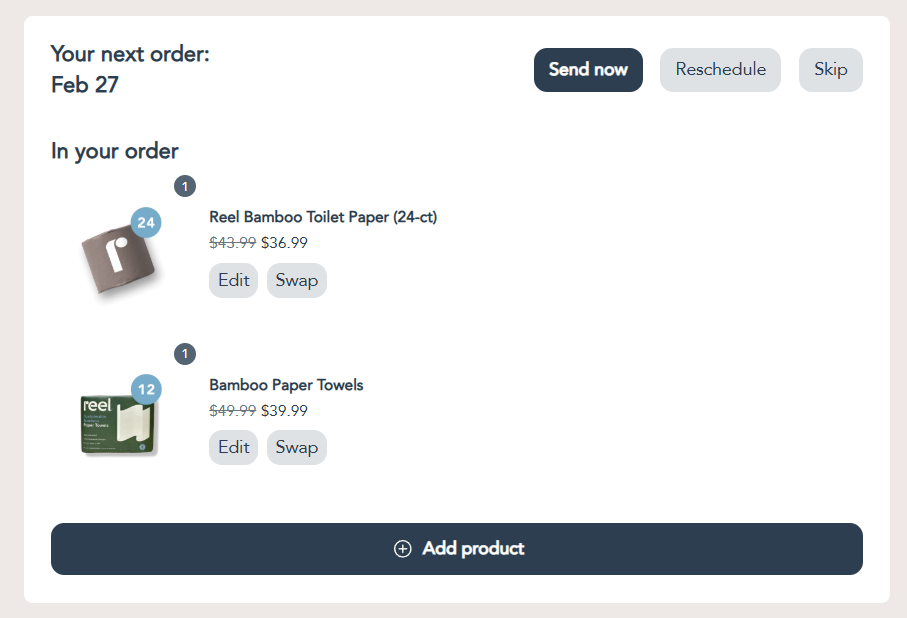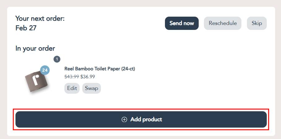 Step 2: In the customer portal home page (the Next Order page), click on the Add Product button in your Next Order section