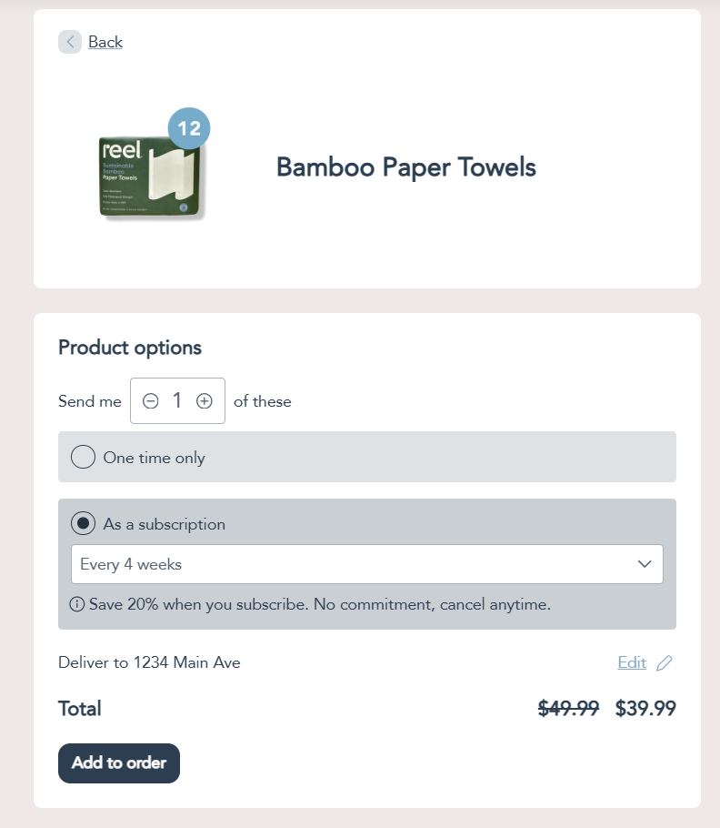 - you can select whether you want this product to be added as a one time purchase or as a recurring subscription. If a recurring subscription, you can also select the desired delivery frequency