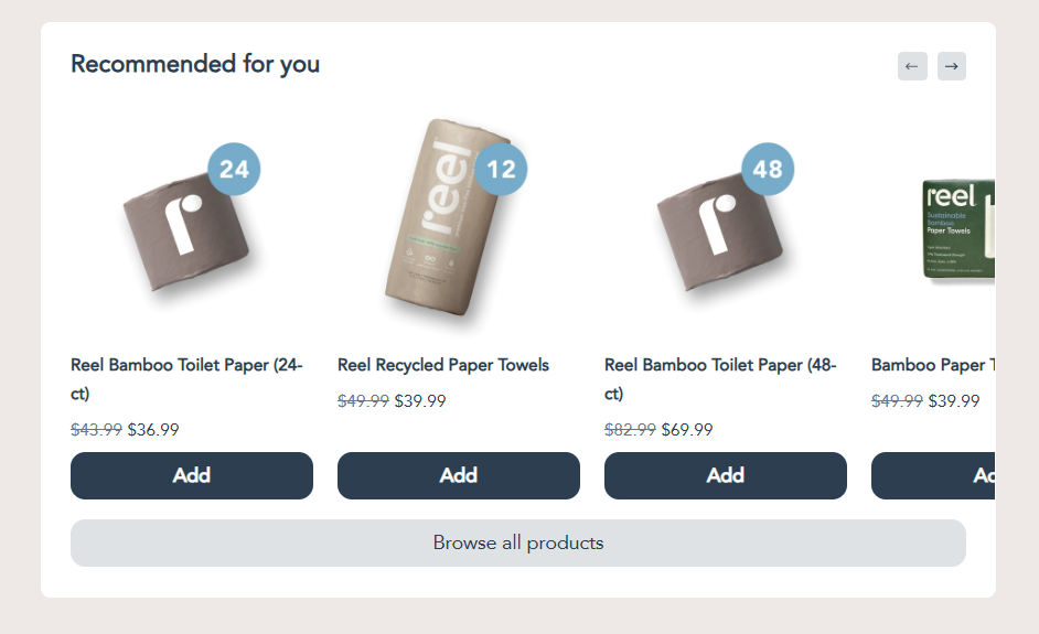 - you can also scroll down to the bottom of the page to the Recommended for you section, and click on Add under the product you want to add to your next order/account