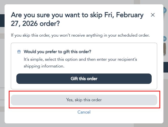 Step 3: A confirmation pop up will appear, click on the Yes, skip this order button to confirm the skip